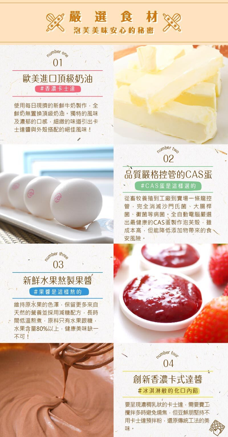 從畜牧養殖到工廠到賣場一條龍控管,完全消滅沙門氏菌、大腸桿菌、黴菌等病菌。全自動電腦嚴選出最健康的CAS蛋製作泡芙殼,雖成本高,但能降低添加物帶來的食安風險。