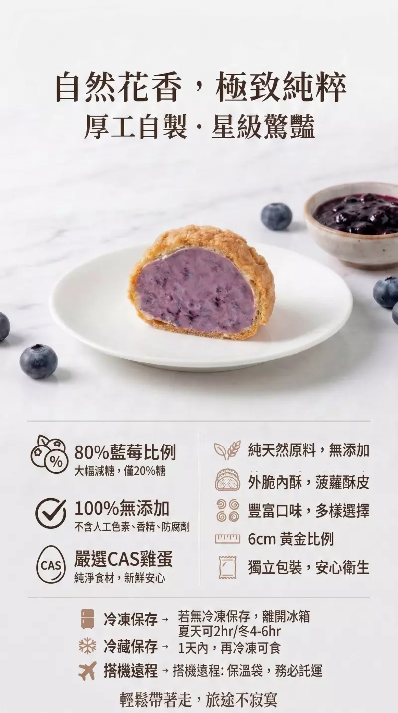 藍莓泡芙的靈魂,來自豆穌朋「厚工」自製的法式藍莓果醬。我們遵循正統法國烹飪與糕點標準,只為將最純粹的莓果精華,完美融入酥脆的波羅外殼與滑順內餡中。