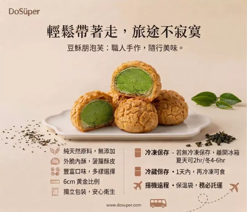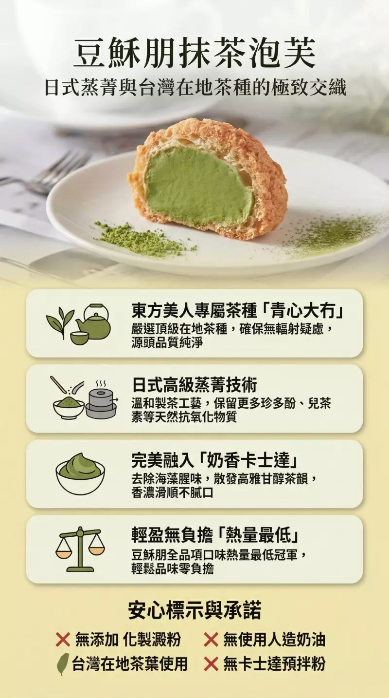 在享受甘醇茶香與滑順奶香交織的奢華口感時,您完全不需擔心負擔!抹茶泡芙是豆穌朋所有泡芙口味中「熱量最低」的絕對冠軍,讓您輕鬆品味,療癒身心零罪惡感。