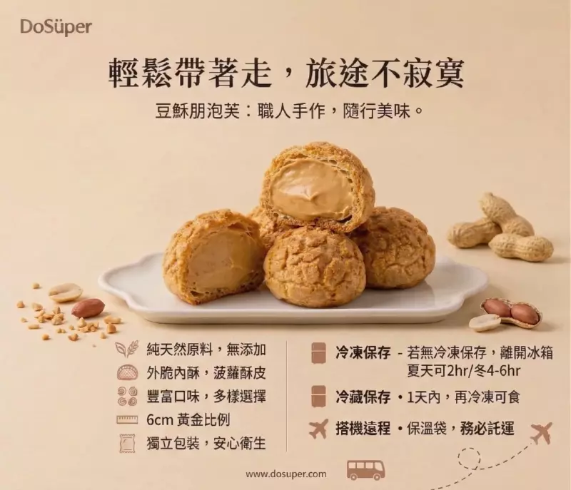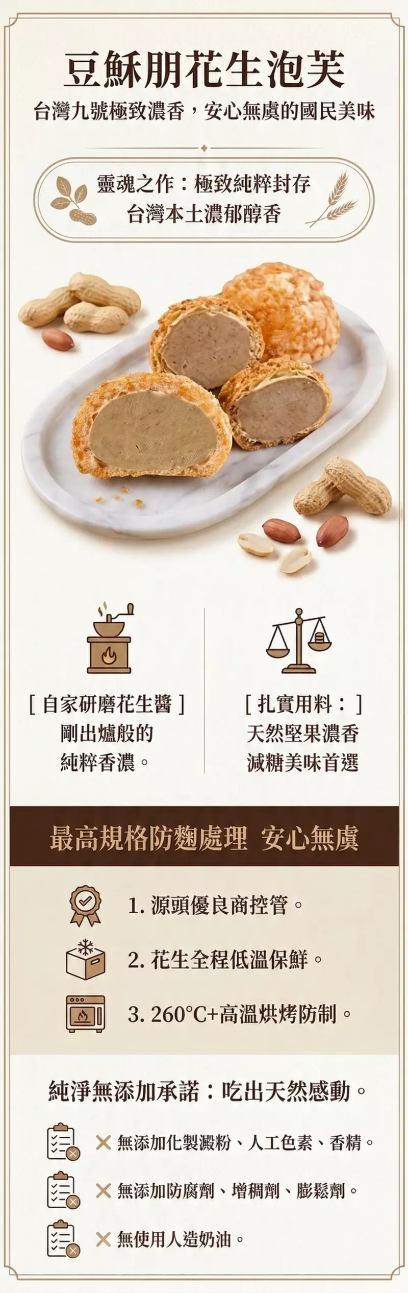 花生泡芙的靈魂,來自我們對頂級食材與極致安全的堅持。我們將本土花生的濃郁醇香,完美封存於酥脆的波羅外殼中,獻上讓無數老饕感動回購的經典美味。