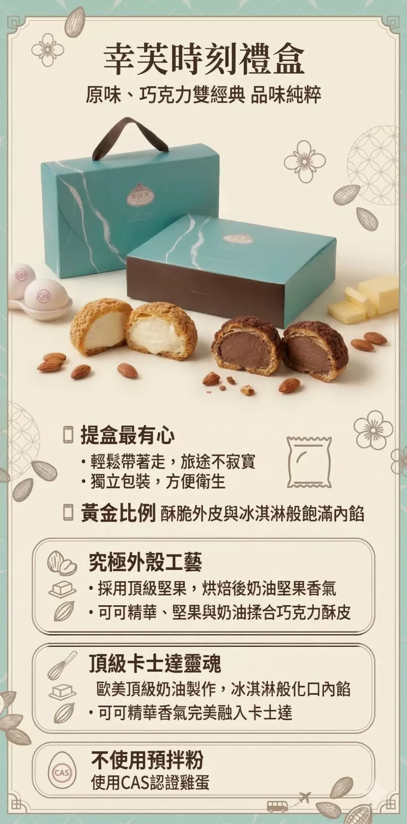 提盒最有心 經典雙口味泡芙禮盒 黃金比例,酥脆餅乾的外皮+冰淇淋般的飽滿內餡 採用頂級堅果,烘焙後濃郁十足堅果奶油香氣 進口頂級奶油製成的卡士達醬,如冰淇淋般化口內餡 上等可可粉、堅果與奶油製成酥脆口感的巧克力酥皮 將可可最精華的香氣融入卡士達