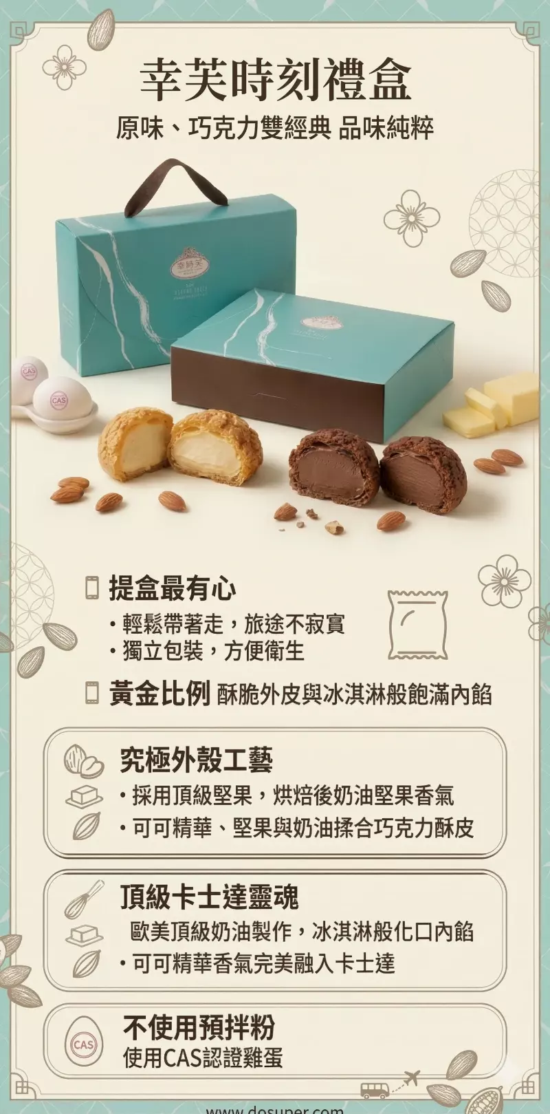 提盒最有心 經典雙口味泡芙禮盒 黃金比例,酥脆餅乾的外皮+冰淇淋般的飽滿內餡 採用頂級堅果,烘焙後濃郁十足堅果奶油香氣 進口頂級奶油製成的卡士達醬,如冰淇淋般化口內餡 上等可可粉、堅果與奶油製成酥脆口感的巧克力酥皮 將可可最精華的香氣融入卡士達