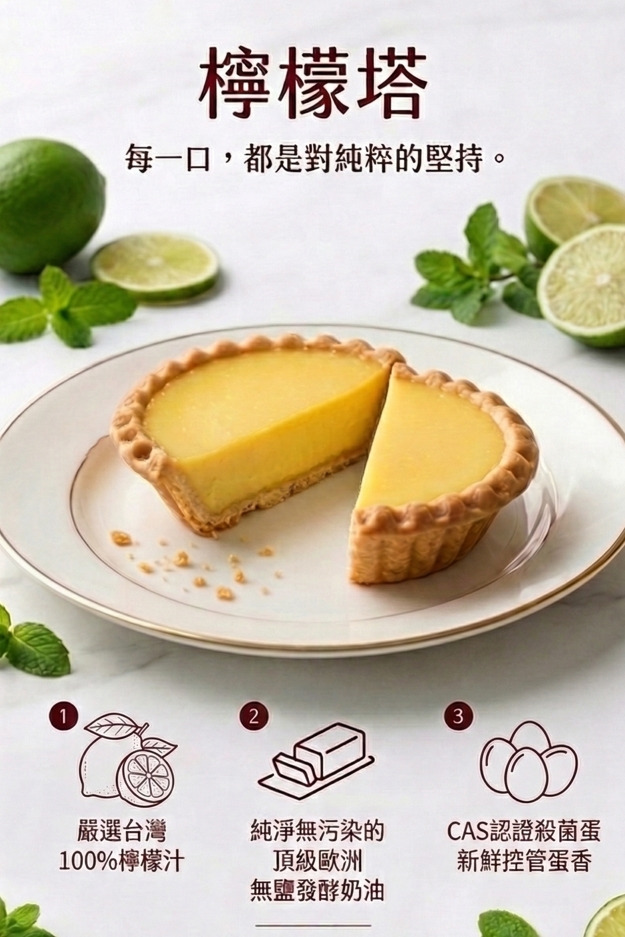 台灣100%檸檬汁:嚴選台灣100%檸檬汁,清香酸甜,造就出新鮮的法式經典檸檬塔,自然帶出果香與柔和酸韻,入口清新不腻。