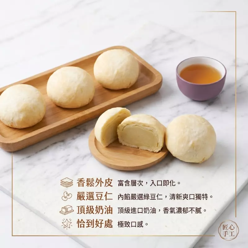 不靠人工香料堆砌,而是透過主廚嚴選的綠豆仁與頂級進口奶油,經由職人手心的溫度,將最討喜的外表與記憶中的滋味完美融合。