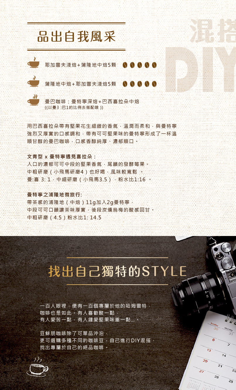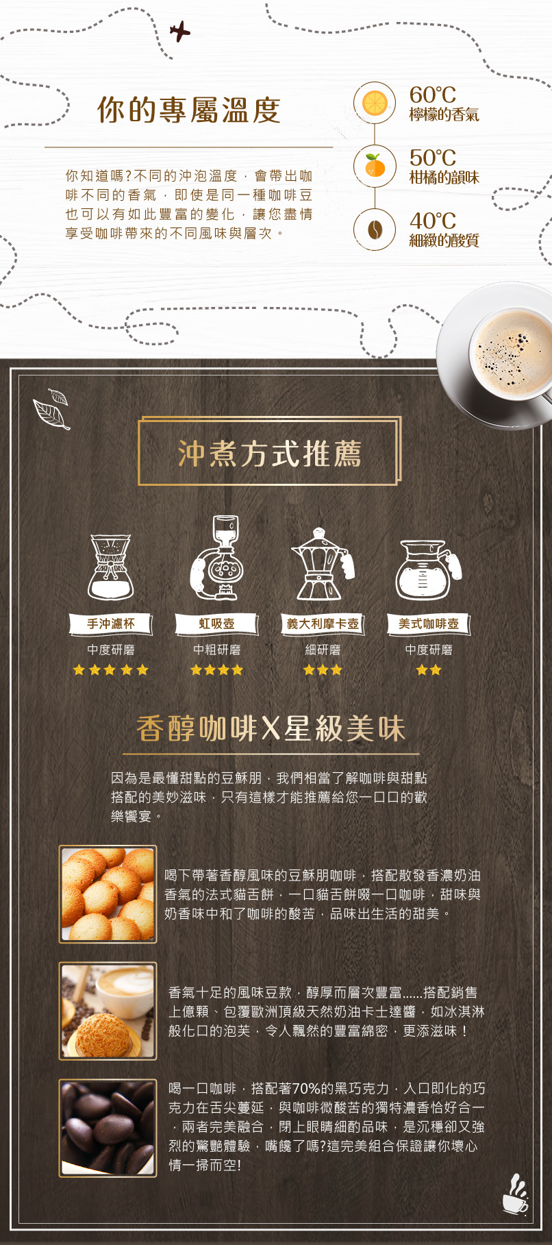 貼心小提醒:風味的呈現因研磨度與沖煮器具與沖煮水溫不同所呈現的感受也會不同