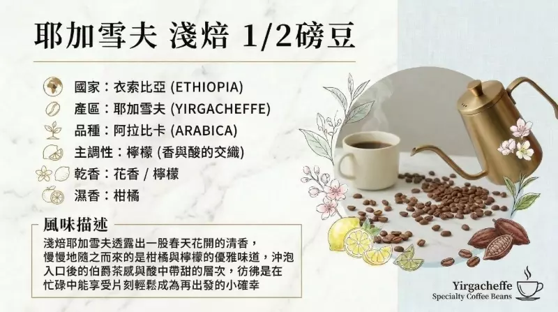 水洗耶家雪夫淺焙1/2磅清新伯爵茶感與酸中帶甜的層次