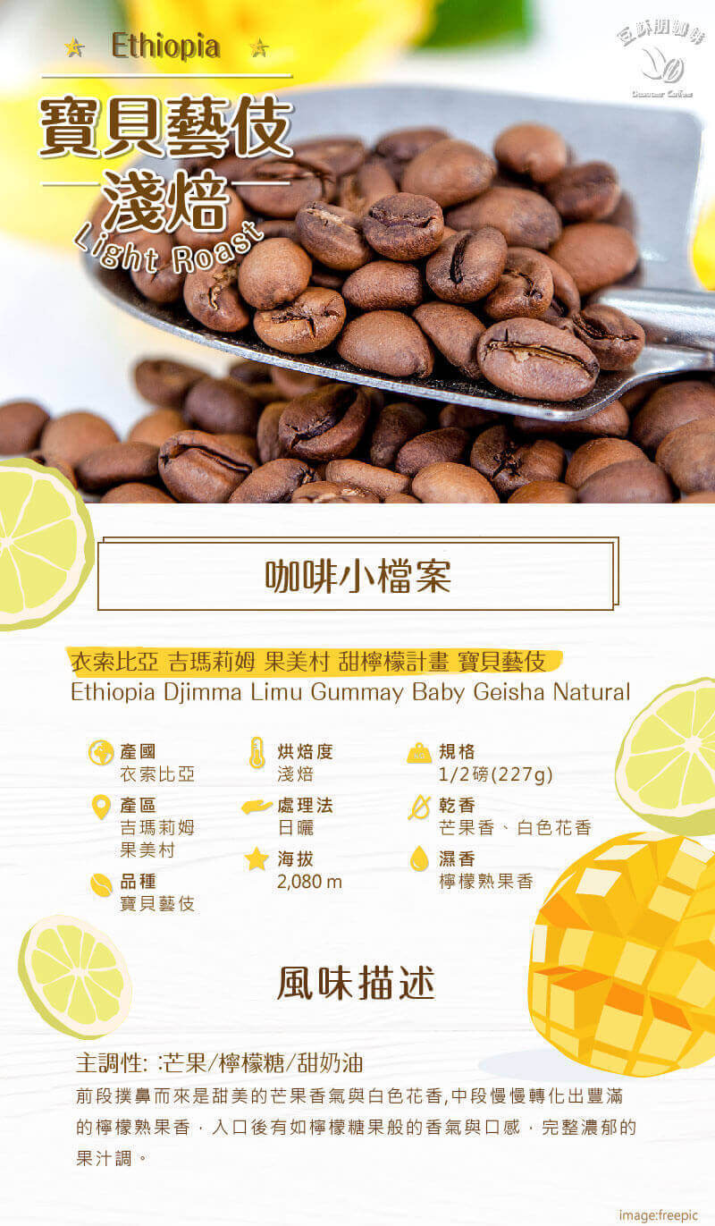衣索比亞 吉瑪莉姆 果美村 甜檸檬計畫【寶貝藝伎】 ■ 國家:衣索比亞 ■ 產區:吉瑪莉姆 果美村 ■ 海拔:2,080 m ■ 處理方式:日曬 ■ 品種:寶貝藝伎 ■ 主調性:芒果、芒果乾、檸檬糖、熱帶水果、葡萄、白色花香、甜奶油(果汁濃郁)