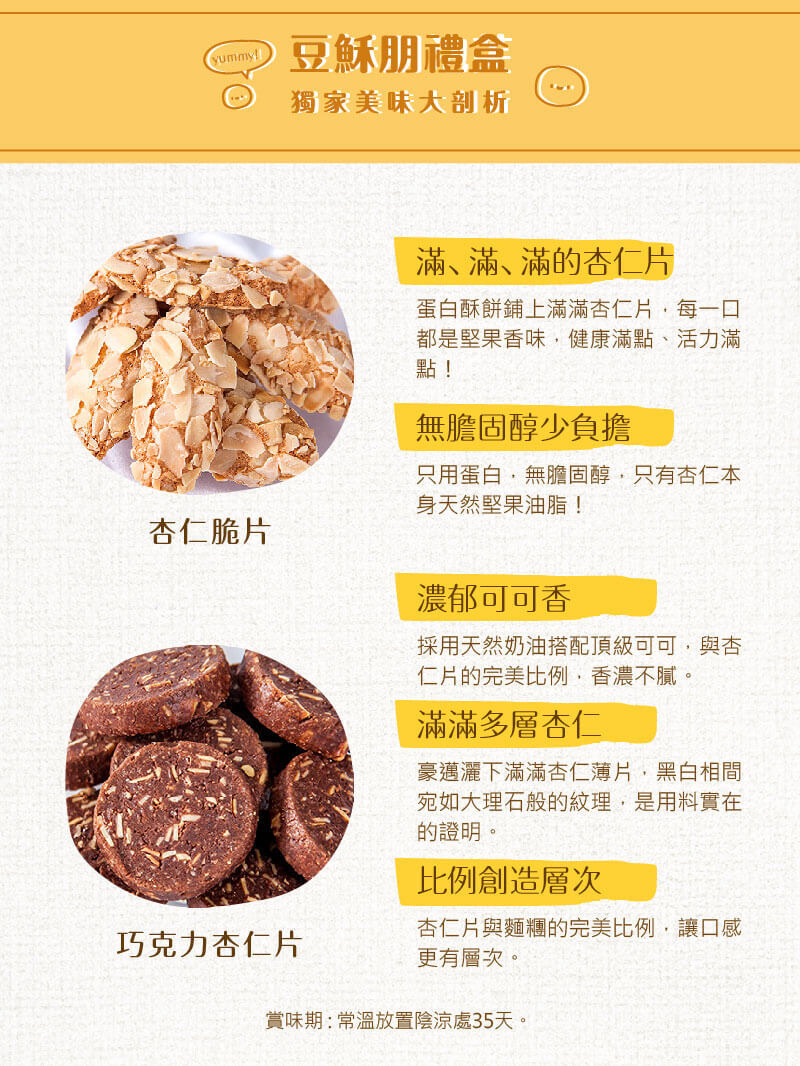 最佳賞味期:常溫35天/奶蛋素食可食/過敏原資訊:本產品含有蛋、牛奶及其製品 內容物:蛋白、杏仁、糖、 麵粉、 規格:100g(約25片) 保存方式:常溫陰涼處