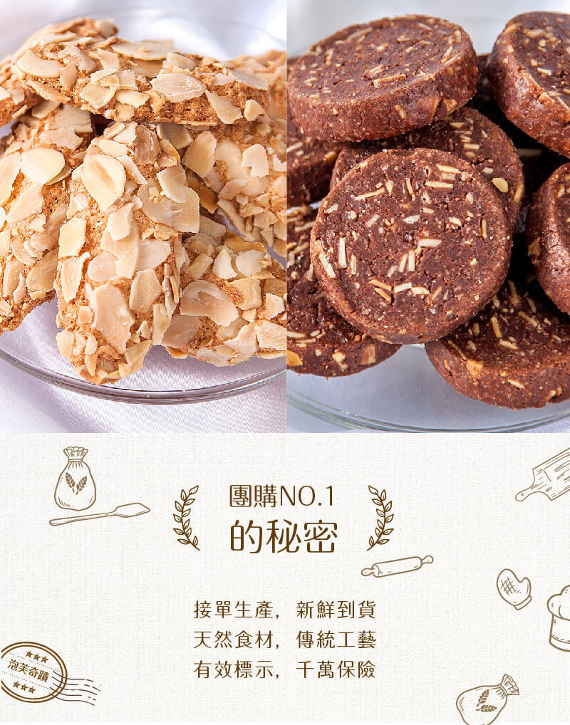 最佳賞味期:35天/奶蛋素食可食/過敏原資訊:本產品含有蛋、牛奶及其製品 內容物:麵粉、奶油、糖、杏仁、奶水、奶粉、可可粉 規格:140克 / 包 保存方式:常溫陰涼處